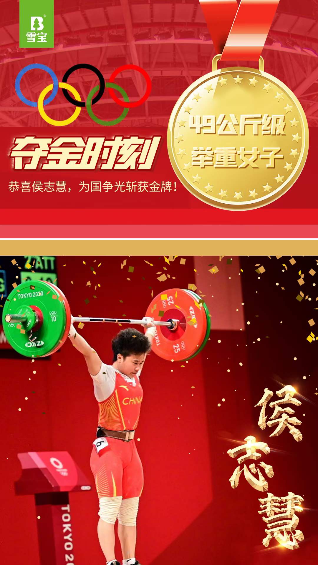 - 雪寶板材祝賀諶利軍在2020東京奧運會67公斤級男子舉重獲得冠軍!