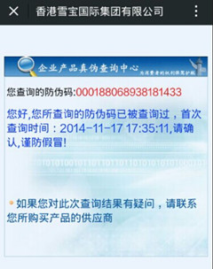 您好,您所查詢的防偽碼已經被查詢過,首次查詢時間:X年X月X日 X時X分X秒,請甄別使用,謹防假冒!