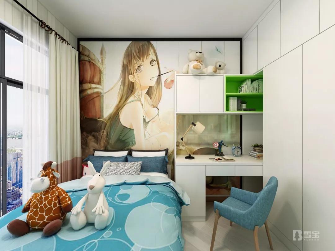 充分結(jié)合七歲孩子的喜好,墻面衣柜與書柜、書桌完美組合,收納和學(xué)習(xí)兼顧。雪寶炫彩板綠野仙蹤花色在以白色色系為主體的組合柜中脫穎而出,動漫墻畫、卡通布偶,以及色系搭配,都讓整個空間散發(fā)出清新自然和滿滿活力感。