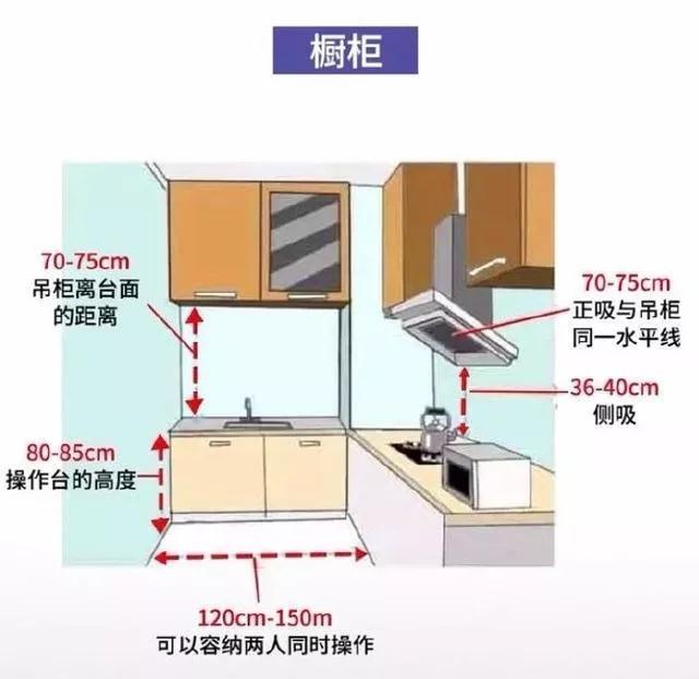 廚房操作臺要按照業主的身高而定,廚房內部至少留出能夠容納2-3人活動的空間。
