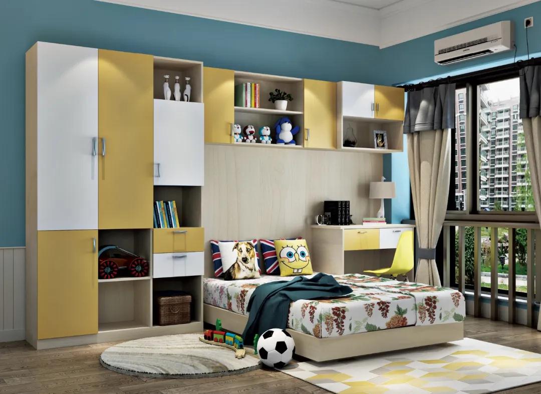 如果不是特別大的房間,推薦采用化零為整的布局思路,把兒童床、衣柜、書桌等家具靠墻擺放,給中間區域更多的空間作為兒童玩耍的地方。