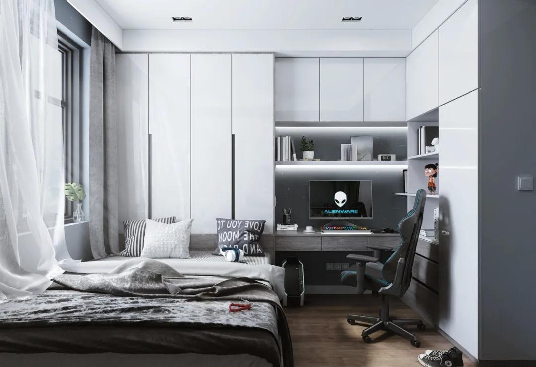 另外,書桌、柜體和床頭整體相連的設計,能合理規劃布局。
