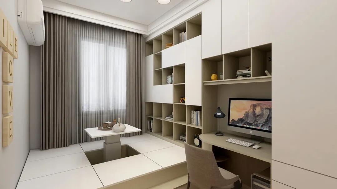 榻榻米多功能房,集次臥、書房、茶室、娛樂室于一體。升起升降桌便是書房、茶室、娛樂室;放下升降桌,鋪上床品,便成了次臥;