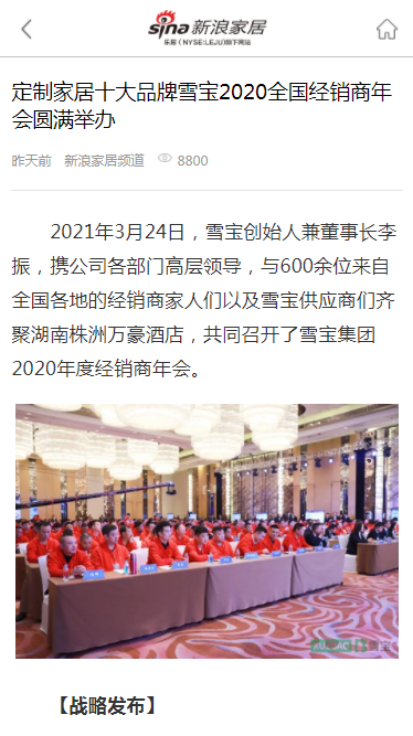 今日頭條、百度、360、新浪家居、搜狐焦點、網易家居、騰訊家居、中國保護消費者基金會、中國質量新聞網、中國木材與木制品流通協會、中國質量萬里行、中國建材網、慧亞網、一兜糖、小紅書、慧聰網、中華衣柜網、央廣網、太平洋家居網、品牌網、齊家、全屋定制網、中國木業網、紅網等等上百家行業主流、權威媒體爭相關注,開啟專題報道,將雪寶2020年度經銷商年會盛典線上曝光度推向高潮。