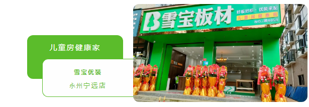 融合空間美學與高端大氣的店面形象、享譽行業的兒童房健康板高環保產品及優質一流的品牌服務的雪寶優裝寧遠店廣迎賓客,為寧遠地區消費者提供一站式消費體驗。