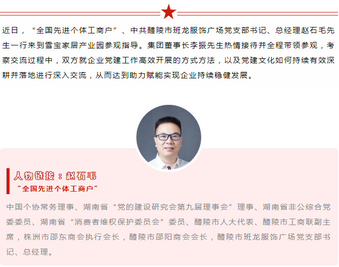 作為其他企業(yè)和政府單位爭(zhēng)相學(xué)習(xí)黨建工作的對(duì)象。因緣際會(huì),在2020年11月,集團(tuán)董事長李振先生攜部分高管走進(jìn)趙石毛先生旗下門店“班龍服飾廣場(chǎng)店”參觀學(xué)習(xí)并深入交流黨建文化落實(shí)企業(yè)發(fā)展方面的有效舉措等;