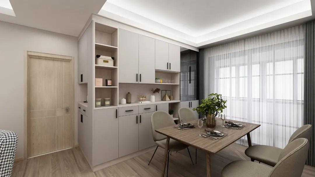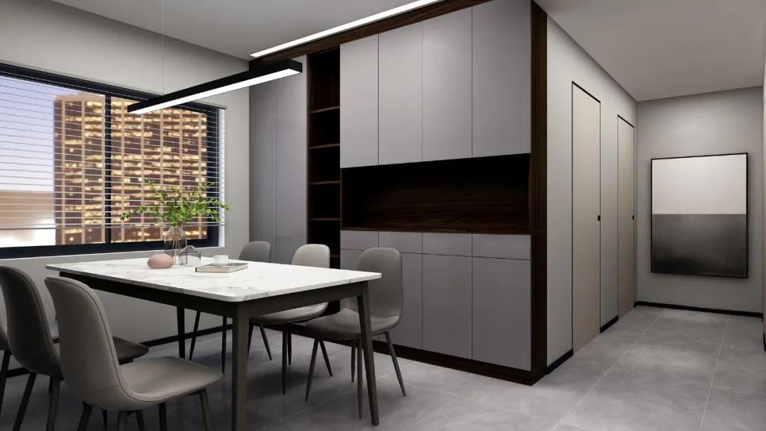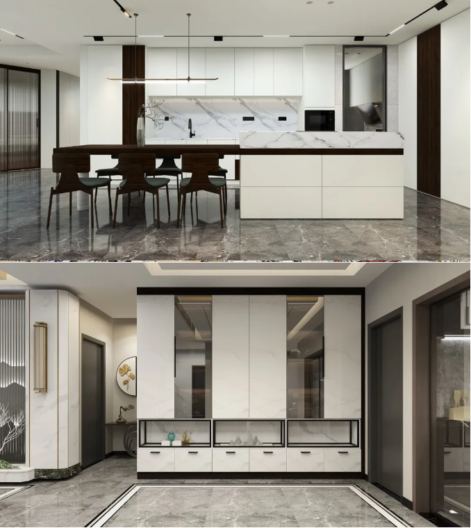 使用PET門板的家具柜用簡約、高級的飾面效果塑造空間的藝術力量,讓整個空間彌漫著一股高級、明亮、時尚,同時又有藝術化的生活氛圍。