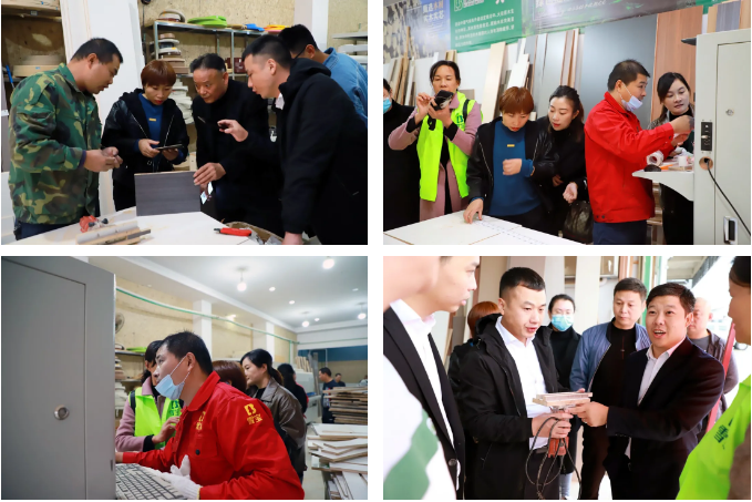 雪寶優裝基于“前店后廠”模式,擁有自己的小型加工廠,標配開料機、封邊機以及其他加工設備。參會經銷商在雪寶優裝平江店加工廠參觀學習,現場觀摩工人進行“二合一工藝”安裝實操及其他生產加工工序。