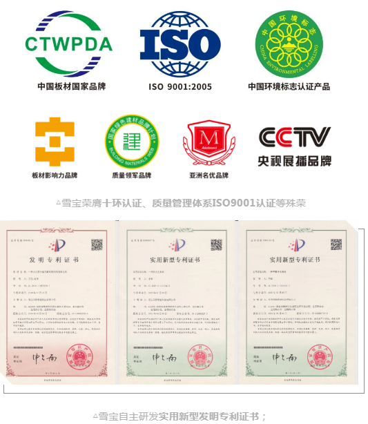 集“國字號”榮譽中國板材國家品牌、國家綠色建材品牌計劃【質量領軍品牌】、中國家居建材行業領軍品牌、定制家居領軍品牌等眾多榮譽于一身的雪寶,質量和環保屬性早已刻入品牌的基因中并傳承。