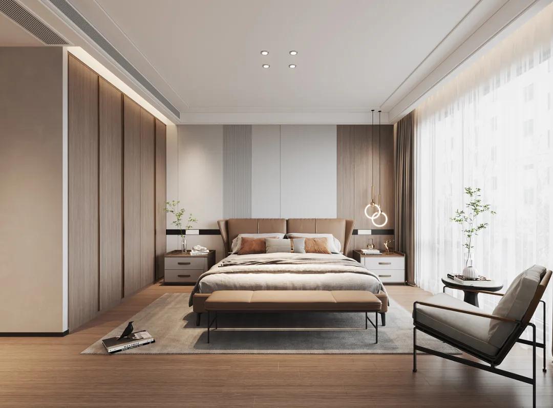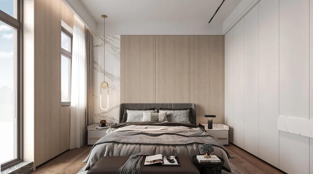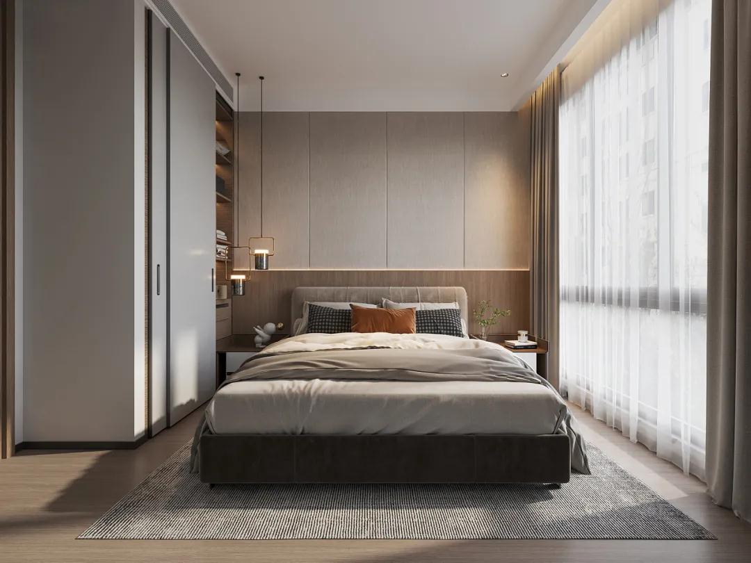 溫和的色調讓臥室內斂沉穩,細膩的質感,在燈光氛圍的烘托下,營造出輕高級的體驗感,視覺空間得到了極好的延伸和拓展,陽光透入,勾勒出從容而協調的氛圍,讓人在這里找到舒適和安逸。