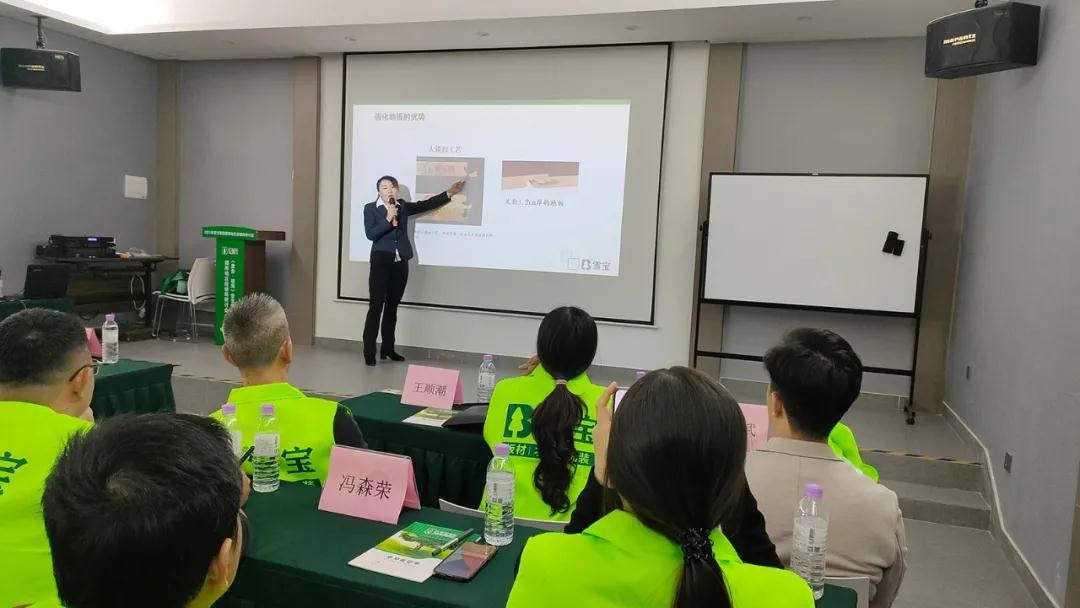 2、活動現場,聶老師詳細講解雪寶木門地板介紹,把產品好處逐一提煉,并用最直接生動、富有沖擊力和記憶點的語言加以概況和描述,基于產品核心賣點深入剖析、產品品質嚴格把控等產品研發核心訴求告知雪寶經銷商們,幫助他們在實際銷售中充分讓消費者知道、理解、喜愛,并認定雪寶的產品就是好!