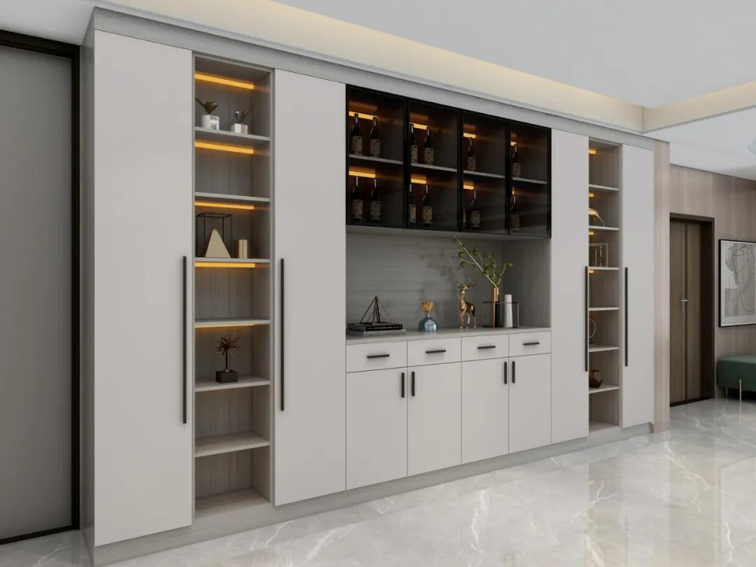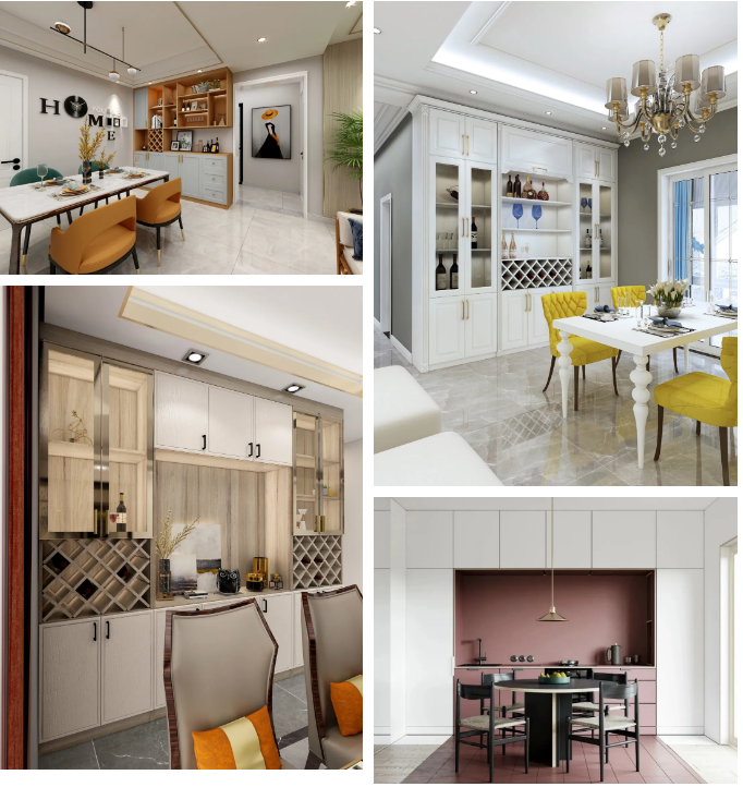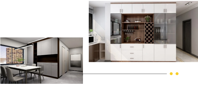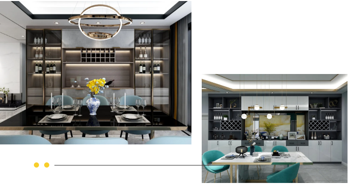 隨著現代生活理念的變化,輕奢元素進入更多年輕一代的生活,能更好的襯托出餐廳的格調。定制餐邊柜將墻面最大程度地利用,一柜到頂,合理劃分區域,做到餐具收納+展示柜+酒柜的多功能結合,是最佳的呈現。