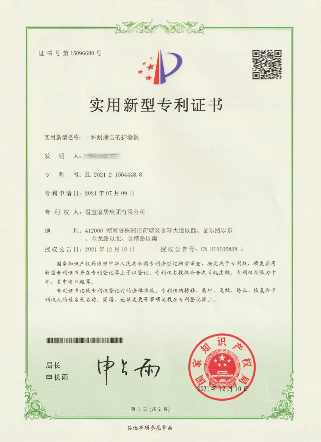雪寶護(hù)墻板經(jīng)國(guó)家知識(shí)產(chǎn)權(quán)局授予實(shí)用新型專利證書