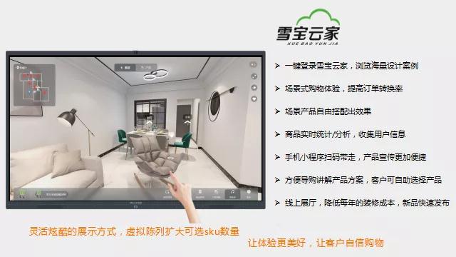 通過(guò)雪寶智慧云屏,客戶只需一鍵切換,輕輕用指尖滑動(dòng),即可隨心切換不同花色、風(fēng)格和產(chǎn)品效果圖,以沉浸式、可視化的方式呈現(xiàn)720°VR全景漫游,提升顧客體驗(yàn)感和代入感。