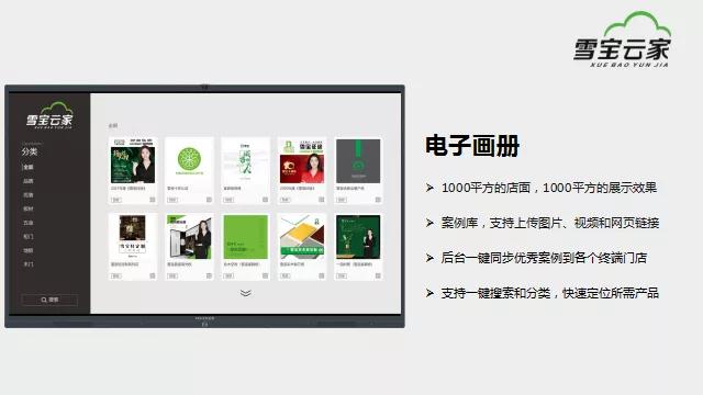 一鍵瀏覽“電子畫冊(cè)”,雪寶線上產(chǎn)品資料庫(kù)無(wú)縫抵達(dá),100平門店即實(shí)現(xiàn)1000平米展示效果。