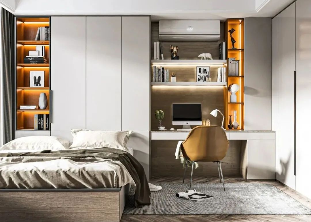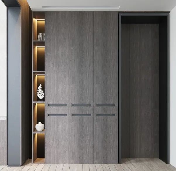 當然,現在還有一種比較尷尬的戶型,那就是臥室門跟電視背景墻在同一側的情況。這時候可以利用柜門與柜體同色系的做法,打造出一款隱形門,既不會影響視覺觀感,還能夠減去敲砌墻的麻煩。