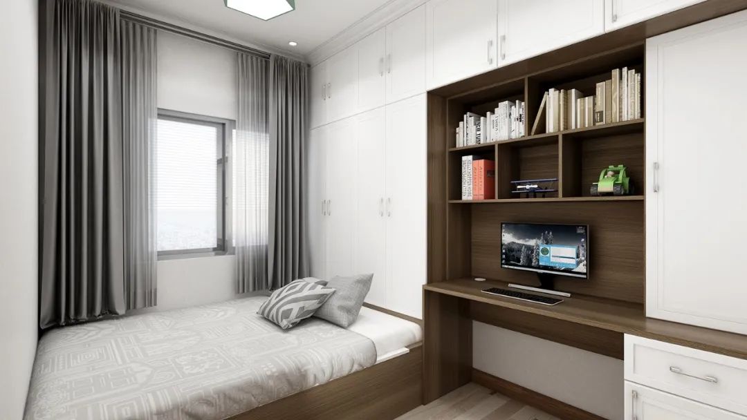 書桌承載了閱讀、書寫、使用電腦等功能,所以書桌務必要買大一些的,但一張大桌子擺在中間確實挺占位置的,這時候就可以試試做成由書柜延伸出來的、轉角式的書桌。