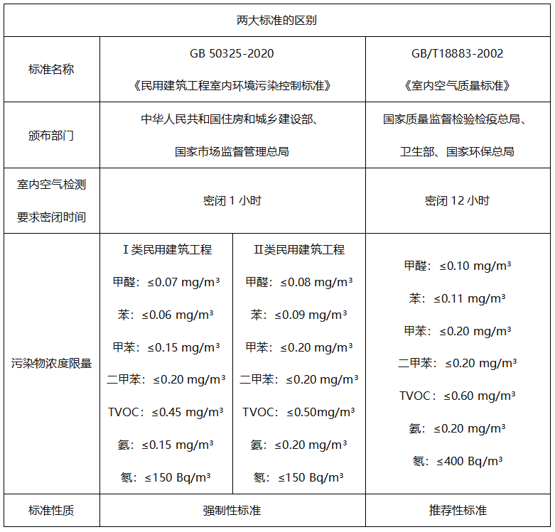 GB/T 18883-2002為國家推薦性標準,檢測前需至少密閉12小時,為極限環境下檢測給出的限值。