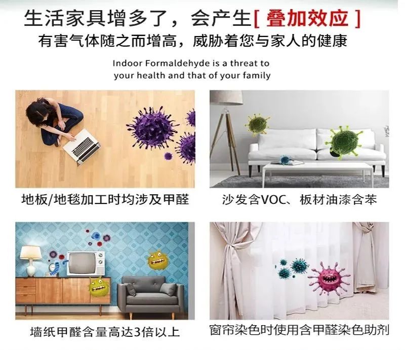 隨著大家健康意識的提高,人們日益關注自身的生活環境,室內空氣質量成為很多人關注的熱點。而說起室內空氣的污染,人們往往會聯想到甲醛。眾所周知,甲醛是一種致癌物,輕則讓人流淚、咽痛各種不適,重則致癌。但就室內污染而言,不能只關注甲醛,而忽略其它污染物的危害。