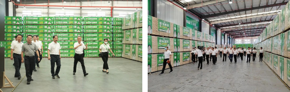在雪寶現代化工廠觀摩中,市區領導一行通過儀器檢測體驗了能釋放負離子的森林有氧板,了解了雪寶智能制造加工生產的標準作業工作流程,并且就如何把板材精準無誤變成板件,最后成為家具柜的工藝全流程聽取了匯報講解。