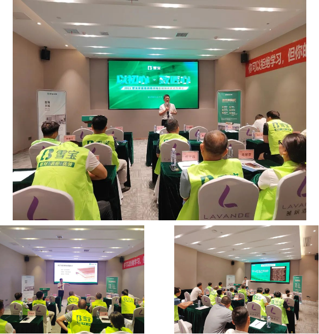 活動現場,雪寶華南營銷中心主動營銷部張經理詳細講解雪寶優裝落地運營及介紹雪寶PET產品。從現狀分析、品牌定制、生產加工、市場競品等方面深入探討以及明確落地優裝的必然性,圍繞終端形象、門店運營、團隊管理、渠道開發、生產賦能、設計賦能、客戶維護等維度剖析雪寶優裝的先進性和優越性。通過實踐與發展證明,以及雪寶優裝取得的顯著成效,充分說明我們從傳統板材營商轉型到雪寶優裝這一條路是行得通的!