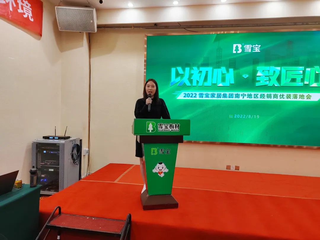 會議伊始,雪寶南寧運營中心總經理殷芬超致辭。“面對嚴峻的市場現狀,我們唯有不斷提高執行力、永葆創新意識,才能讓自己的門店有方法統籌、有業績提升、有發展壯大,才能獲得成功。而轉型升級落地雪寶優裝,打造標準規范的優裝門店是取得成功的一條康莊大道!”