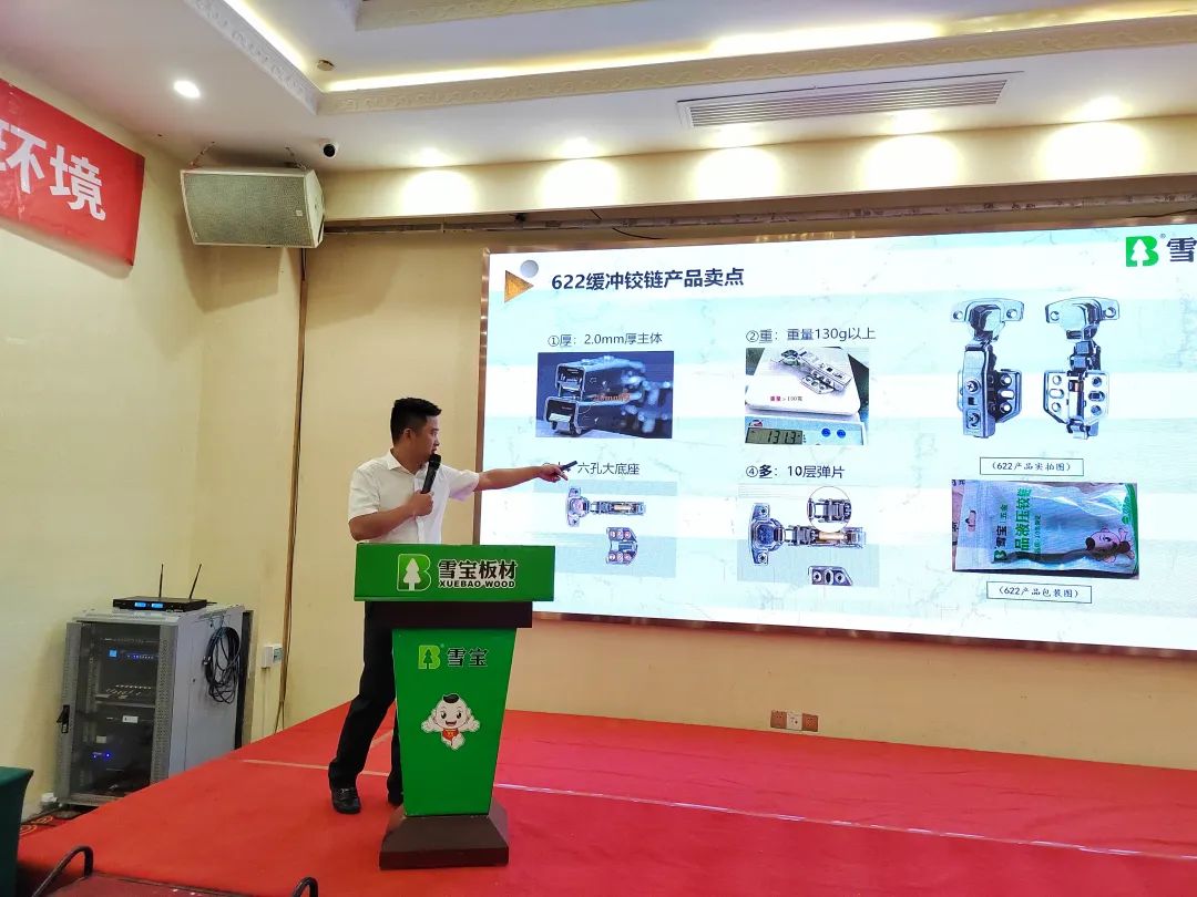 好產品價值的直接體現離不開專業的產品知識宣導。會上,五金部易磊進行了雪寶五金產品的介紹,雪寶華南優裝部經理譚勤智作雪寶PET產品的介紹。