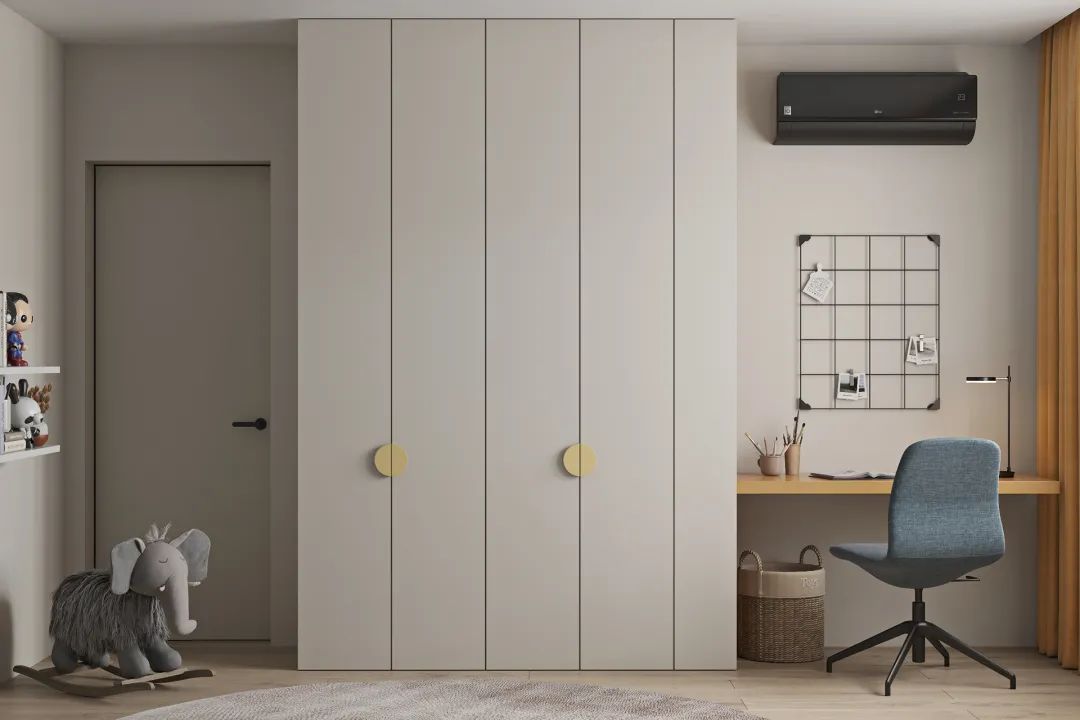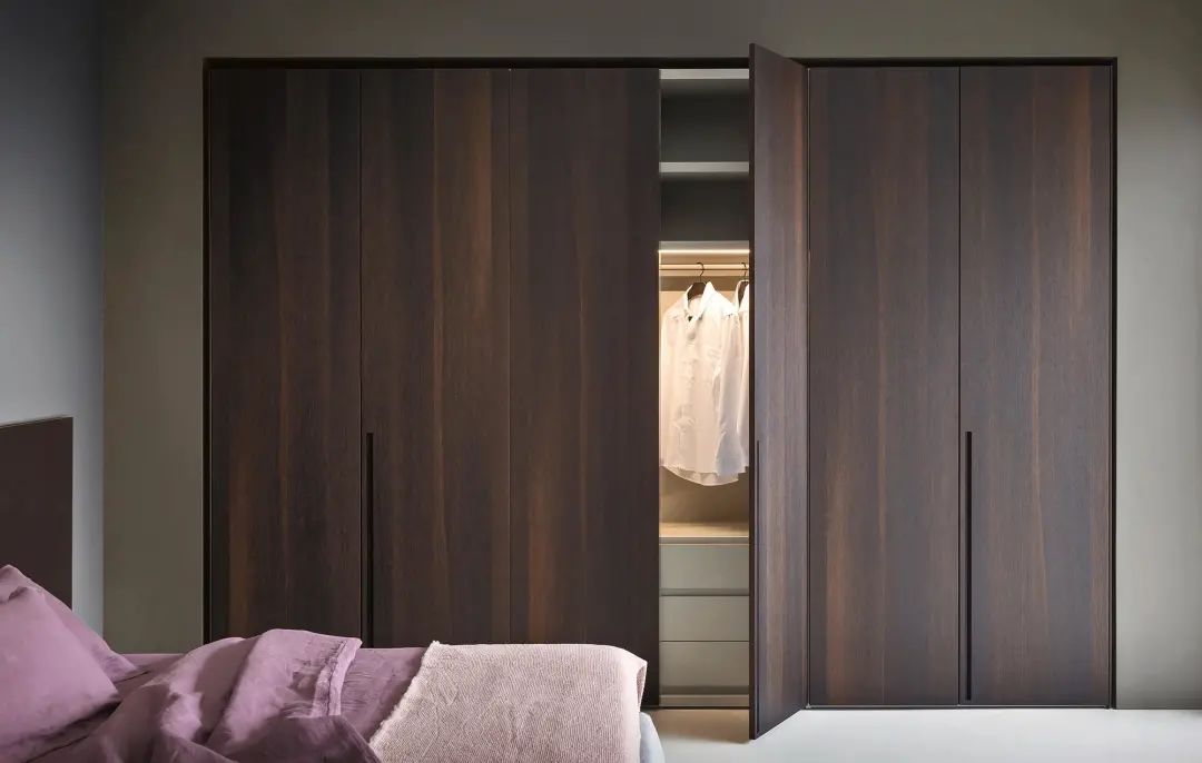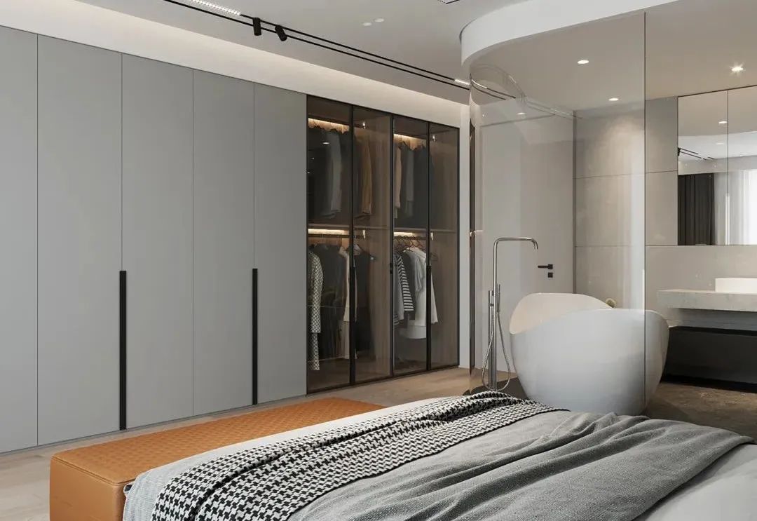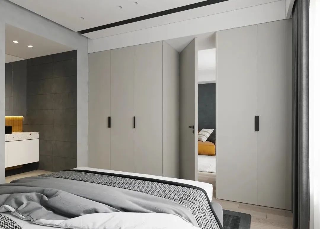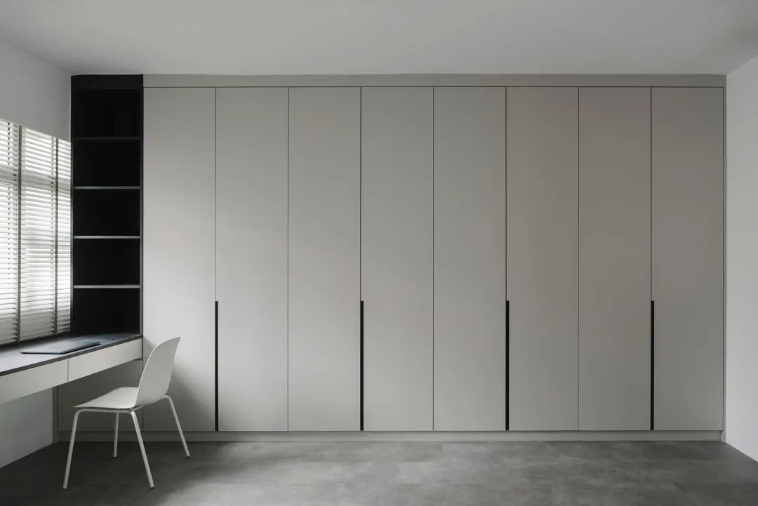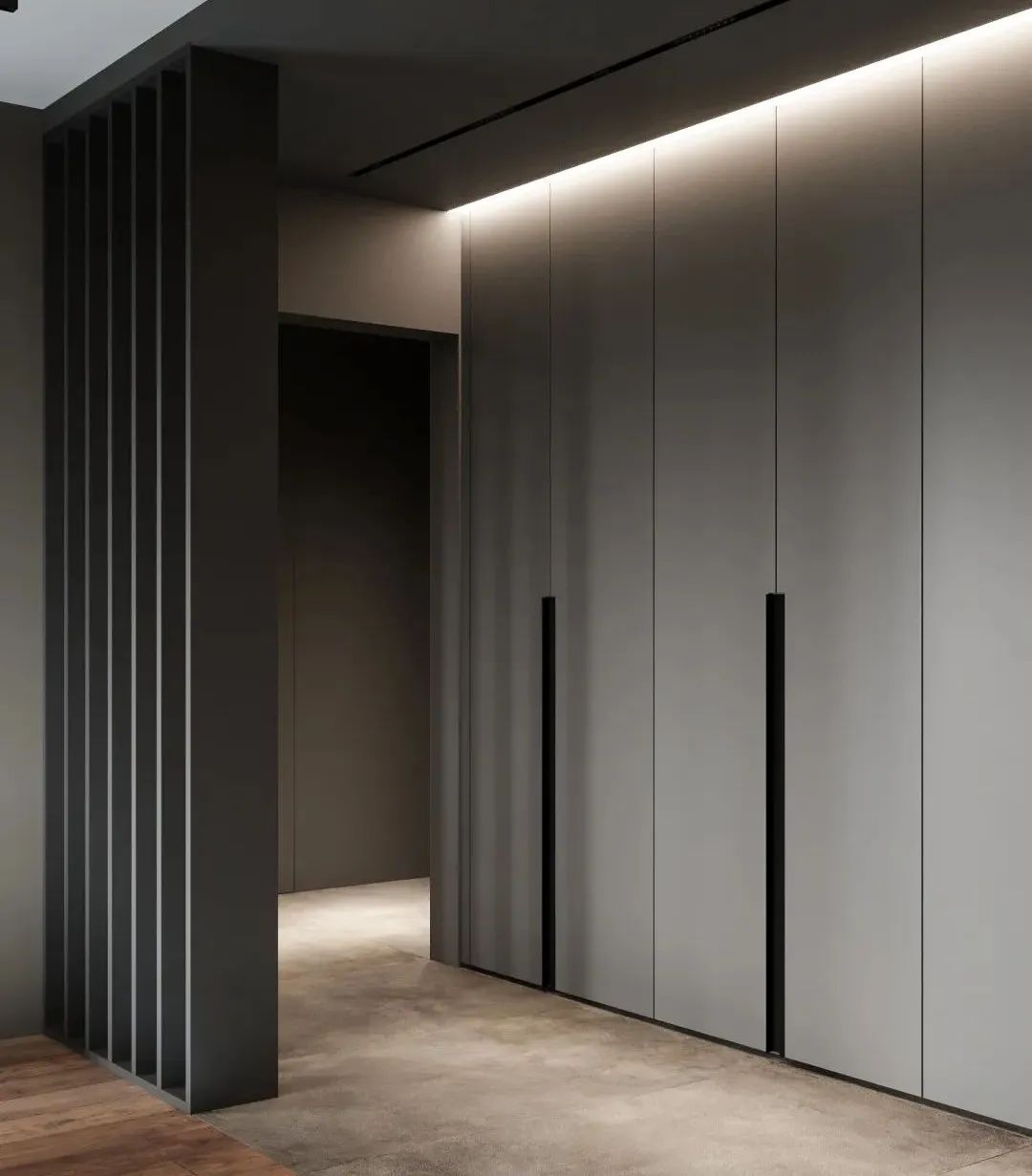 傳統的衣柜柜門板如果要封邊,都是使用的PVC的封邊材料,但是如果超高柜門依然采用PVC封邊條材料,完全是扛不住柜門變形的風險,但經過改良采用鈦合金或者鋁合金的材料,來替代原本的PVC材料封邊,拉手做成通頂式,并且用鋁合金或鈦合金包覆,一般會在拉手之間的縫隙預留出45°左右的斜角,或者預留圓弧兩種拉手的形式方便打開柜門,這樣一來,既完成了封邊,也防止變形,同時拉手還具備超高的顏值,這種方式是較為常見且受歡迎。