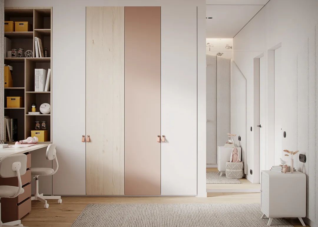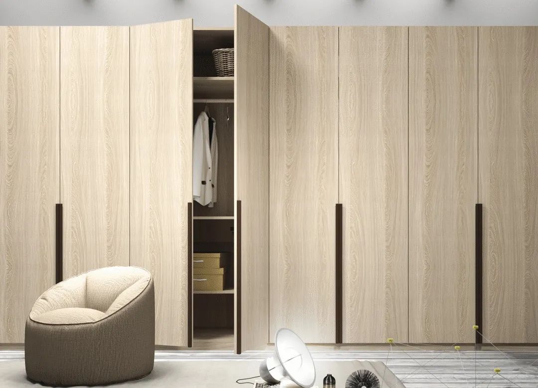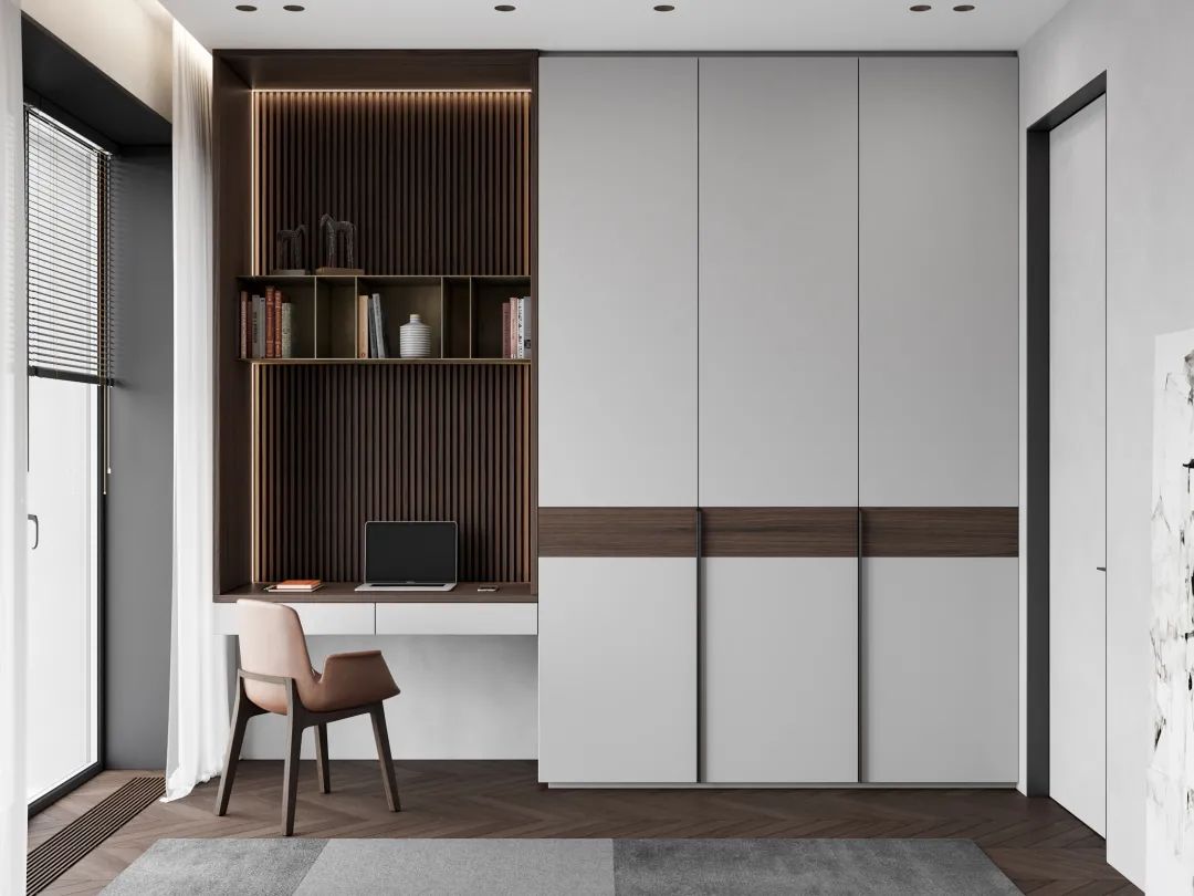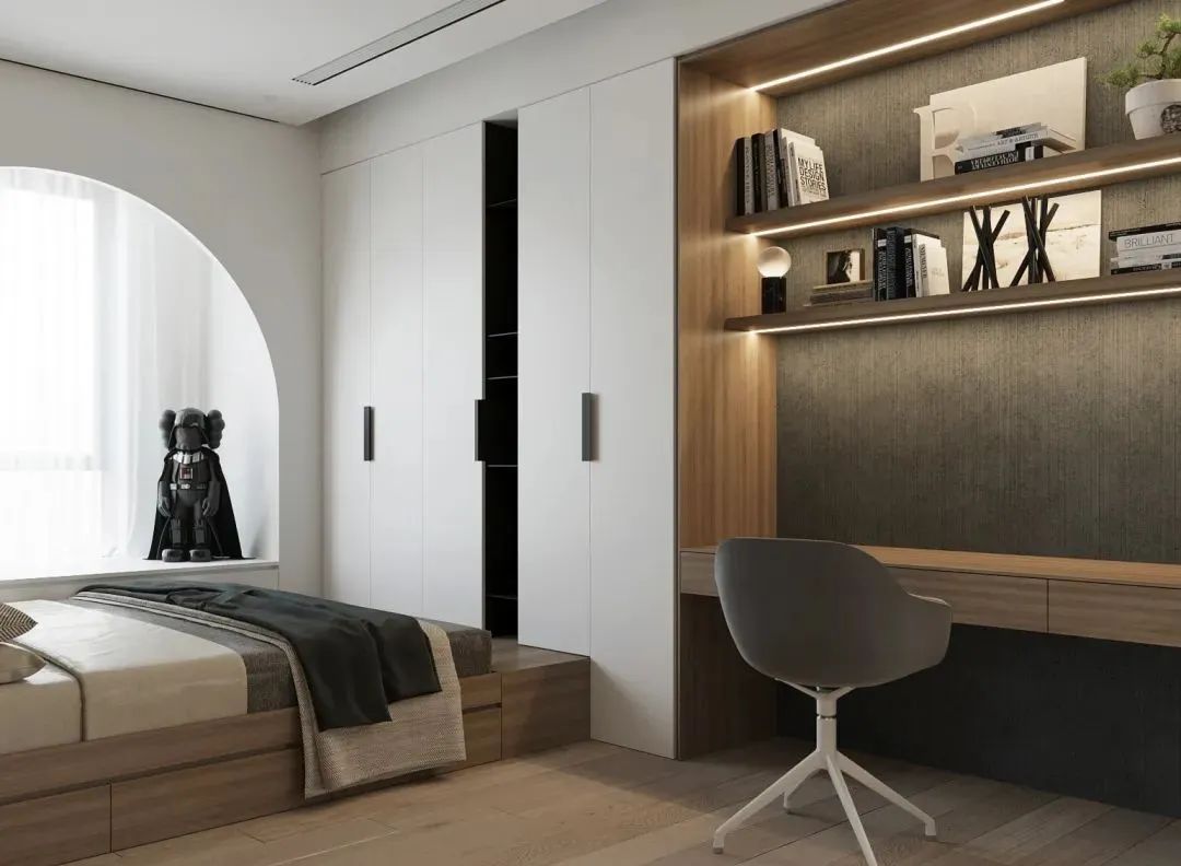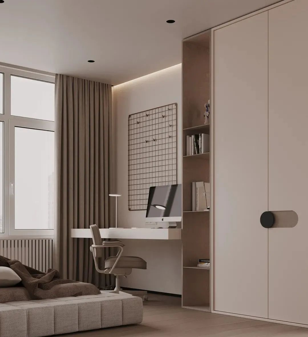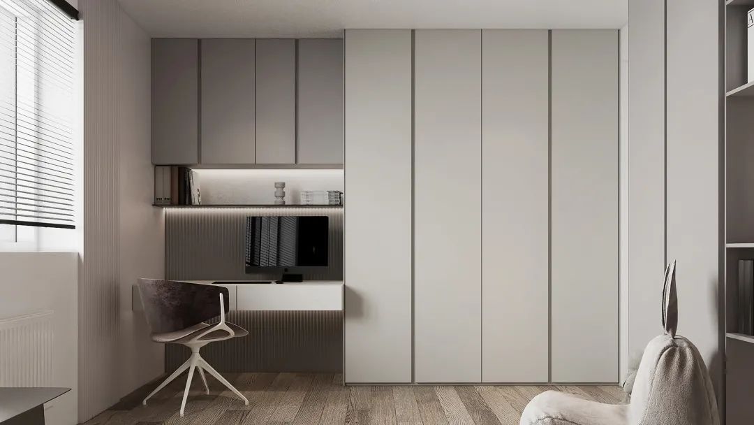 傳統的衣柜柜門板如果要封邊,都是使用的PVC的封邊材料,但是如果超高柜門依然采用PVC封邊條材料,完全是扛不住柜門變形的風險,但經過改良采用鈦合金或者鋁合金的材料,來替代原本的PVC材料封邊,拉手做成通頂式,并且用鋁合金或鈦合金包覆,一般會在拉手之間的縫隙預留出45°左右的斜角,或者預留圓弧兩種拉手的形式方便打開柜門,這樣一來,既完成了封邊,也防止變形,同時拉手還具備超高的顏值,這種方式是較為常見且受歡迎。