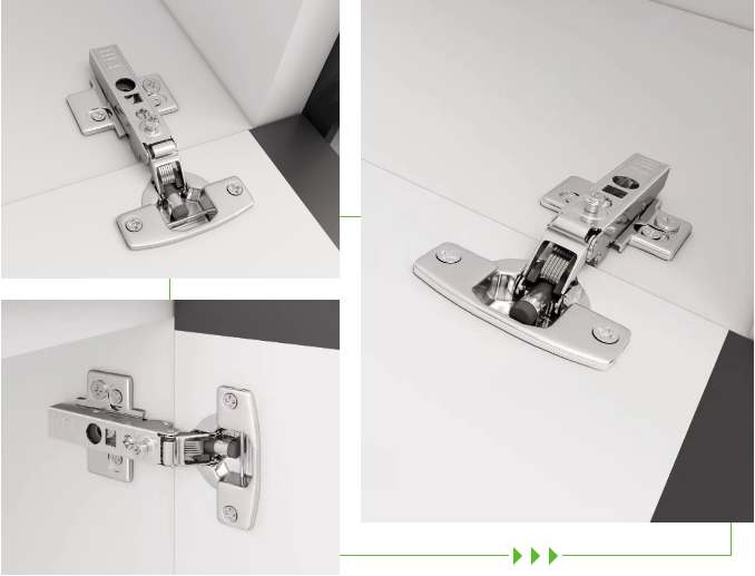 890超級靜音鉸鏈采用先進的兩段力結構,前半段彈簧處于不工作狀態,即柜門開啟的一瞬間門板不會來回晃動(普通液壓鉸鏈開啟柜門的一瞬間,門板都會晃動3-5下),能夠保證板材對螺絲握釘力穩定性,很好的起到了保柜護門的效果,并且柜門開啟和關閉時手感輕盈。