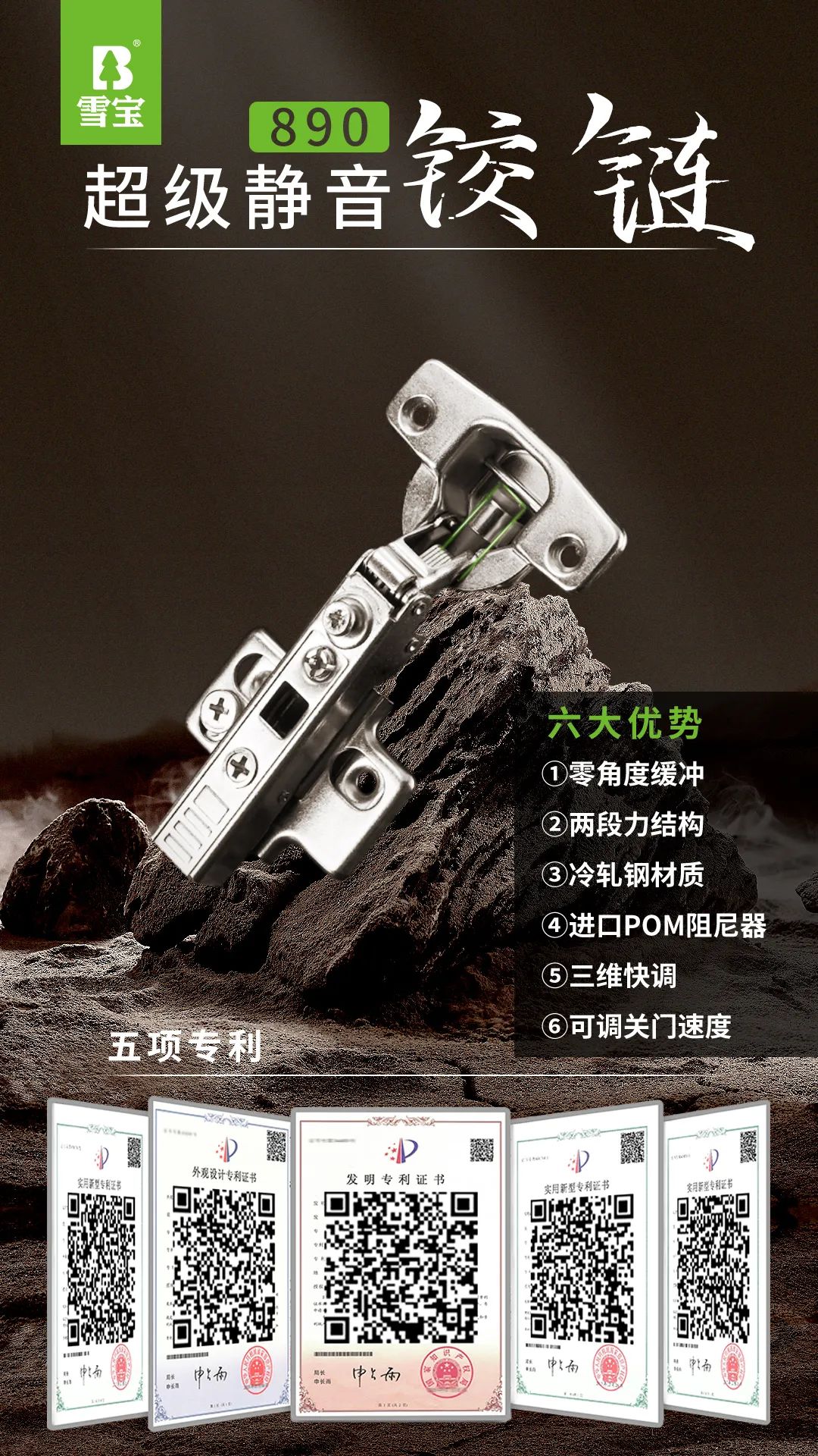 雪寶超級靜音鉸鏈系列產品匠心鑄造,采用國際領先的工藝技術,超強防銹、靜音緩沖、安裝便捷等能力經得起種種考驗,無論在油煙聚集的廚房,還是潮濕通風不佳的洗手間,依然保持光亮如新,輕柔無聲,開合自如!此次雪寶890超級靜音鉸鏈升級研發,具備零角度緩沖、兩段力結構、冷軋鋼材質、進口POM阻尼器、三維快調、可調關門速度6大優勢,并且這是一款已經獲得1個國家發明專利、3個實用新型專利、1個外觀專利的超級靜音鉸鏈!