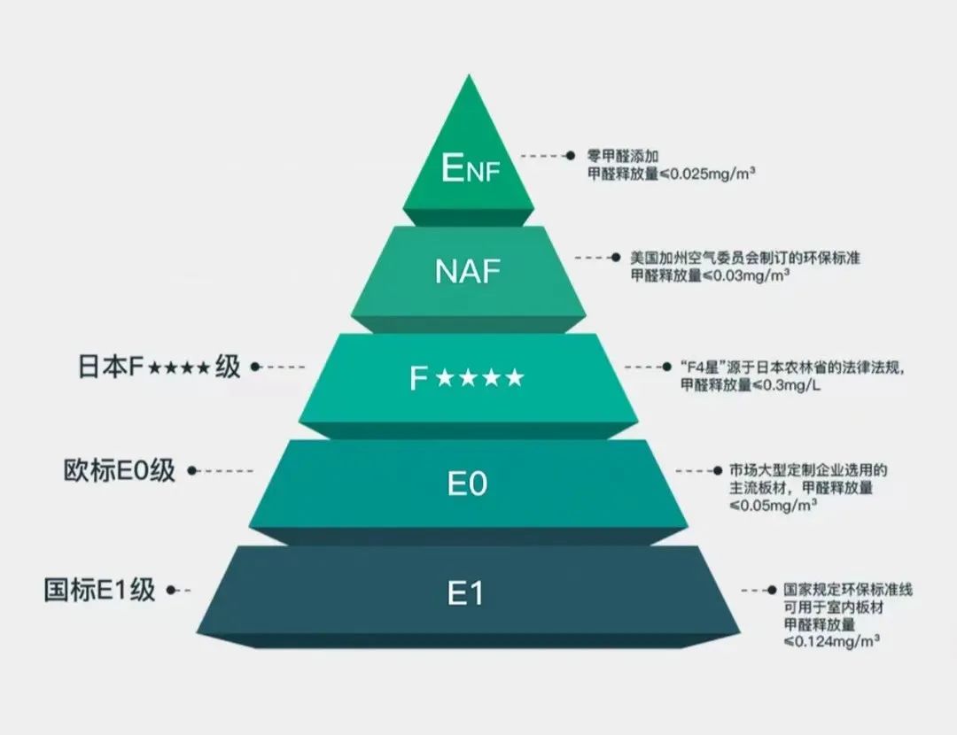 該標準將室內用人造板及其制品的甲醛釋放量按照限量值分為3個等級,即E1級(≤0.124mg/m³)、E0級(≤0.050mg/m³)和ENF級(≤0.025mg/m³)。新國標ENF級成為了全球人造板行業最嚴苛的環保等級標準,規定甲醛釋放量數值超過歐美、日本環保標準。