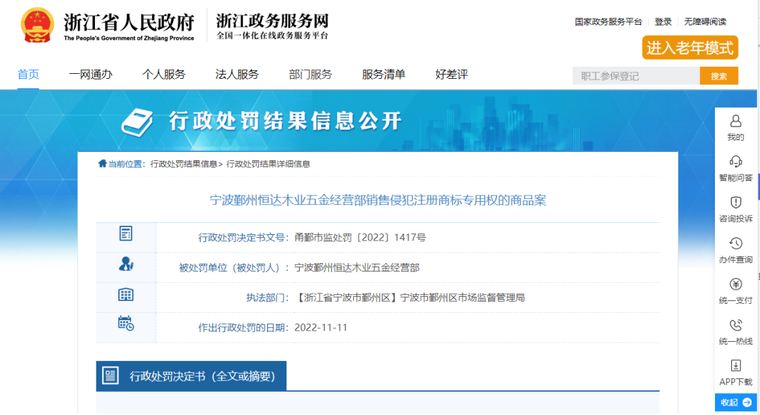 寧波市鄞州區(qū)市場監(jiān)督管理局從案件的初步核查、立案到調(diào)查取證等各個環(huán)節(jié),均發(fā)現(xiàn)侵權人存在違法違規(guī)行為;在該局的高度重視、秉公執(zhí)法、重拳出擊下,寧波鄞州恒達木業(yè)五金經(jīng)營部最終得到了相應的行政處罰決定。
