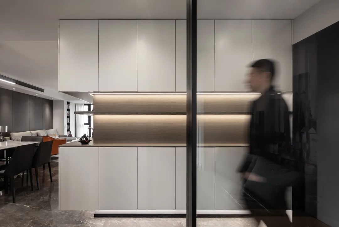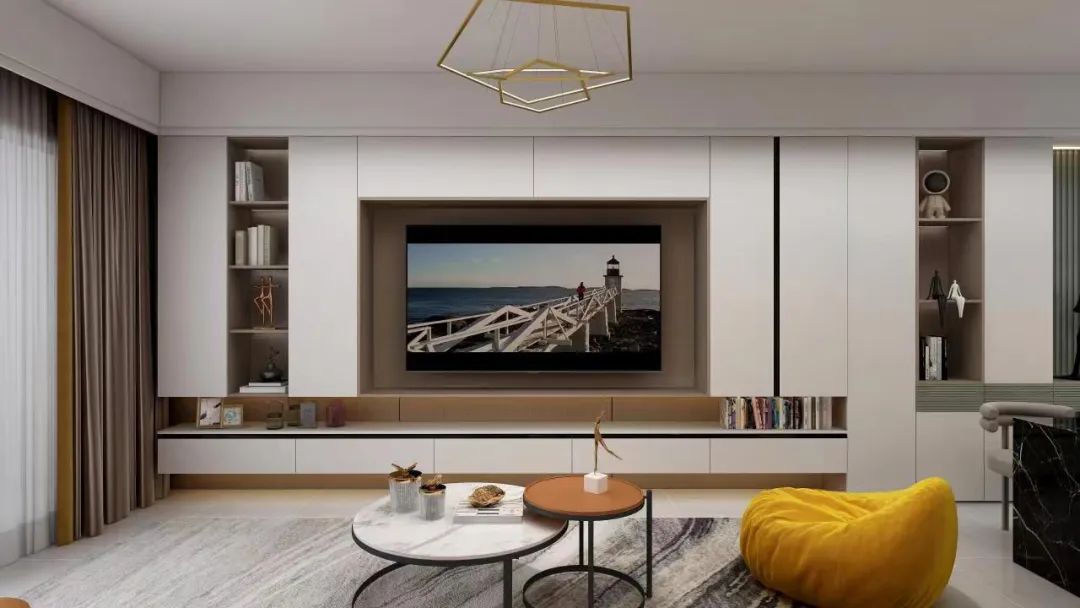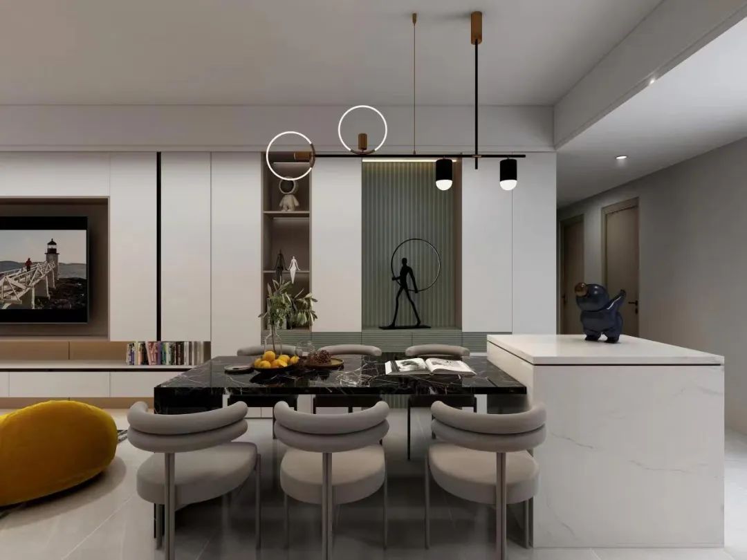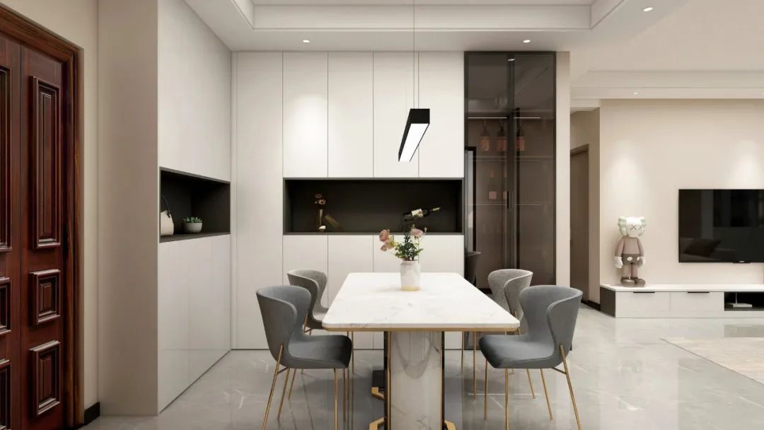 如果覺得客餐廳沒有隔斷,空間區域劃分不明顯的話,還可以在電視柜與餐邊柜中間設計整列開放格或其它方式作為視覺觀感上的區隔。