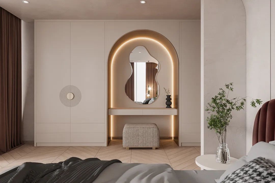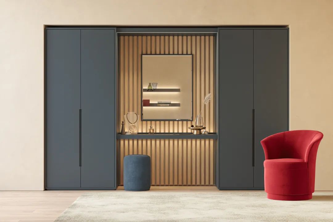 當然,除了延展出來,也可以直接把梳妝臺“裝”在衣柜里,做衣柜時提前設計好在某一處空出一個空間,定制一個置物格,安裝抽屜,充當梳妝臺面,不僅整體性強,也更節省空間。
