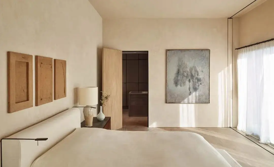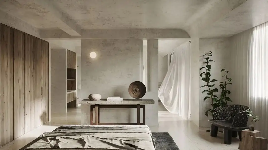 侘寂風多采用天然質感的材質,整體效果質樸自然。除卻侘寂本身的質感,空間同樣有極簡的美感。
