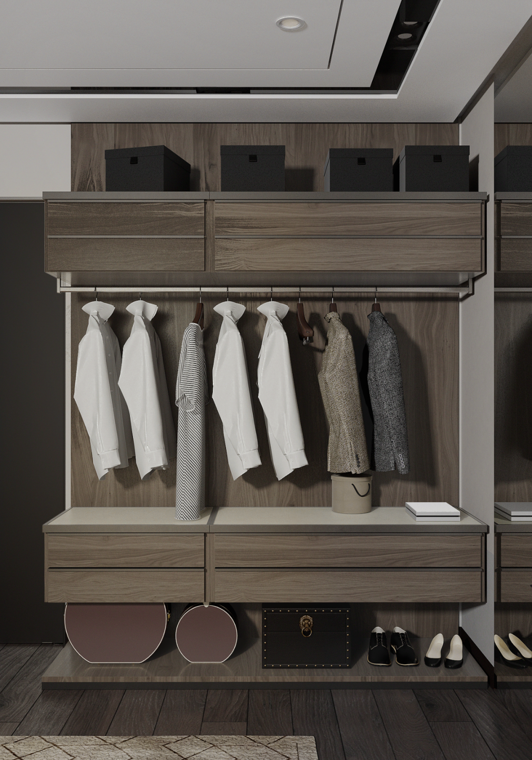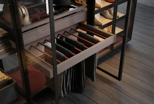 襯板:將衣物或配飾放在帶滑軌的推拉襯板中,搭配、取用一目了然。