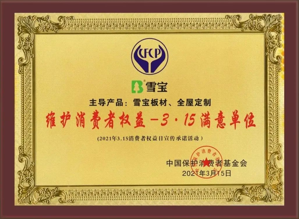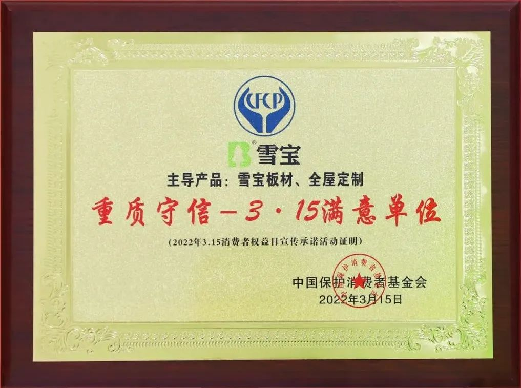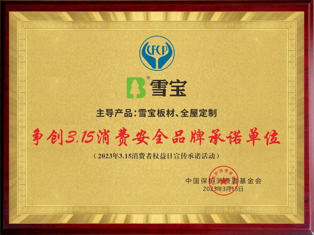 經(jīng)過多輪嚴(yán)格的評審與篩選,雪寶家居集團(tuán)有限公司主導(dǎo)產(chǎn)品雪寶板材、全屋定制品類以優(yōu)異的產(chǎn)品品質(zhì)和良好的消費口碑,被中國保護(hù)消費者基金會授予“爭創(chuàng)3•15消費安全品牌承諾單位”!