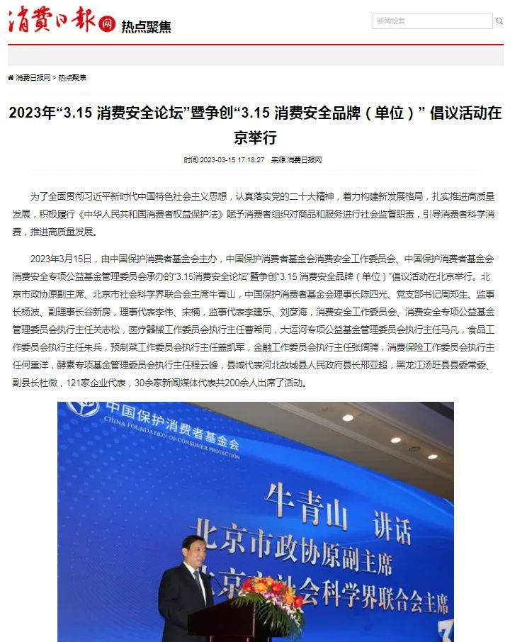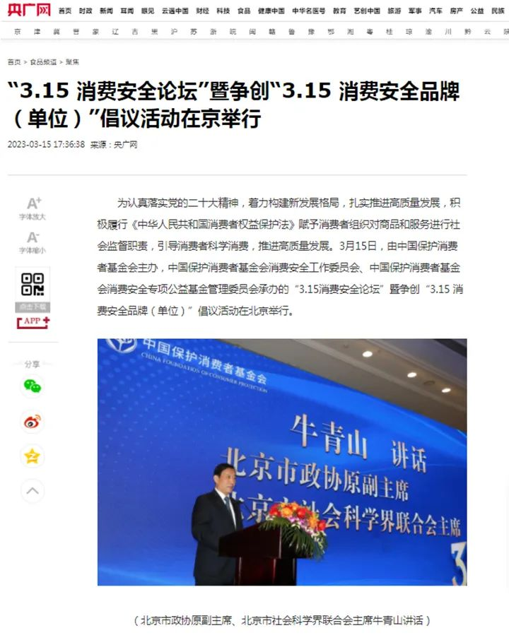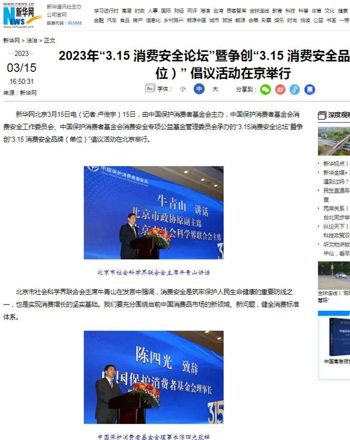 2023年3月15日,由中國保護(hù)消費者基金會主辦,中國保護(hù)消費者基金會消費安全工作委員會、中國保護(hù)消費者基金會消費安全專項公益基金管理委員會承辦的“3.15消費安全論壇”暨爭創(chuàng)“3.15 消費安全品牌(單位)”倡議活動在北京舉行。雪寶受邀出席,并被授予“爭創(chuàng)3•15消費安全品牌承諾單位”!