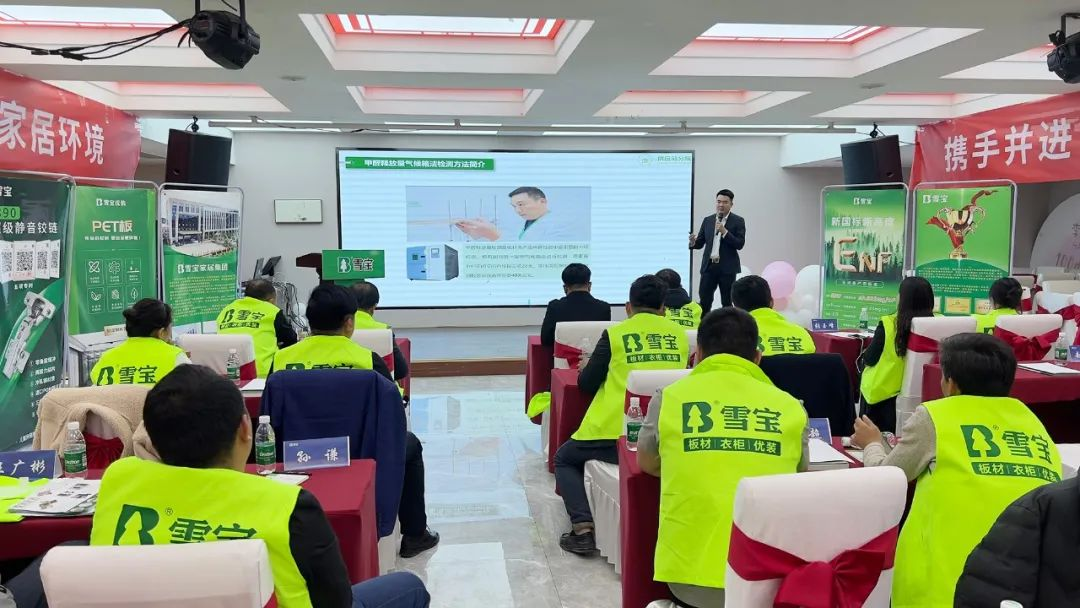 雪寶華北生態(tài)板事業(yè)部山東省區(qū)經(jīng)理裴禹哲先生現(xiàn)場(chǎng)詳細(xì)解讀雪寶ENF級(jí)板材產(chǎn)品知識(shí)及核心賣點(diǎn)。