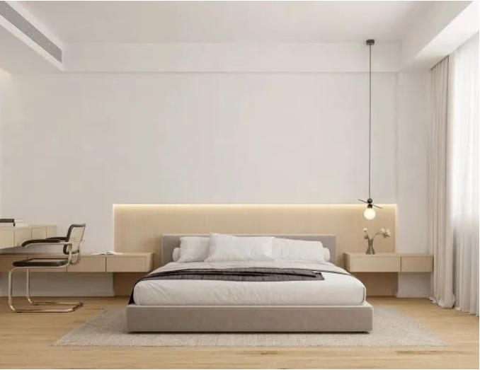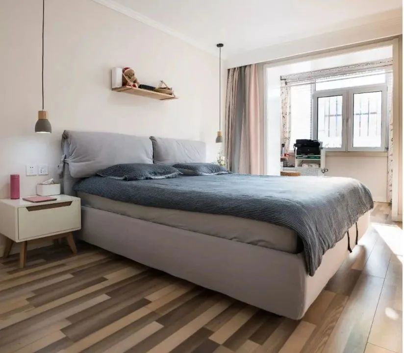 如果你想床頭旁邊的位置更加簡潔一點,可以考慮采用隔板的形式,這種設計非常簡潔。