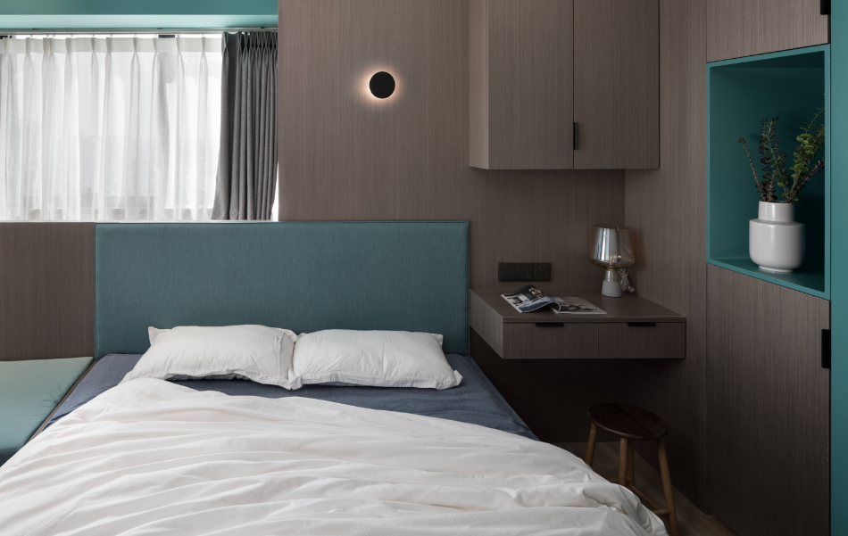 臥室安靜隱蔽,十分適合辦公或者寫作業。床頭柜+書桌一體化后,不僅可以收納物品,還打造了一個學習區域,讓臥室空間實現一房兩用。兩者重合會自然呈現一個高度差,提升空間的功能性的同時,增加了臥室的靈動性。