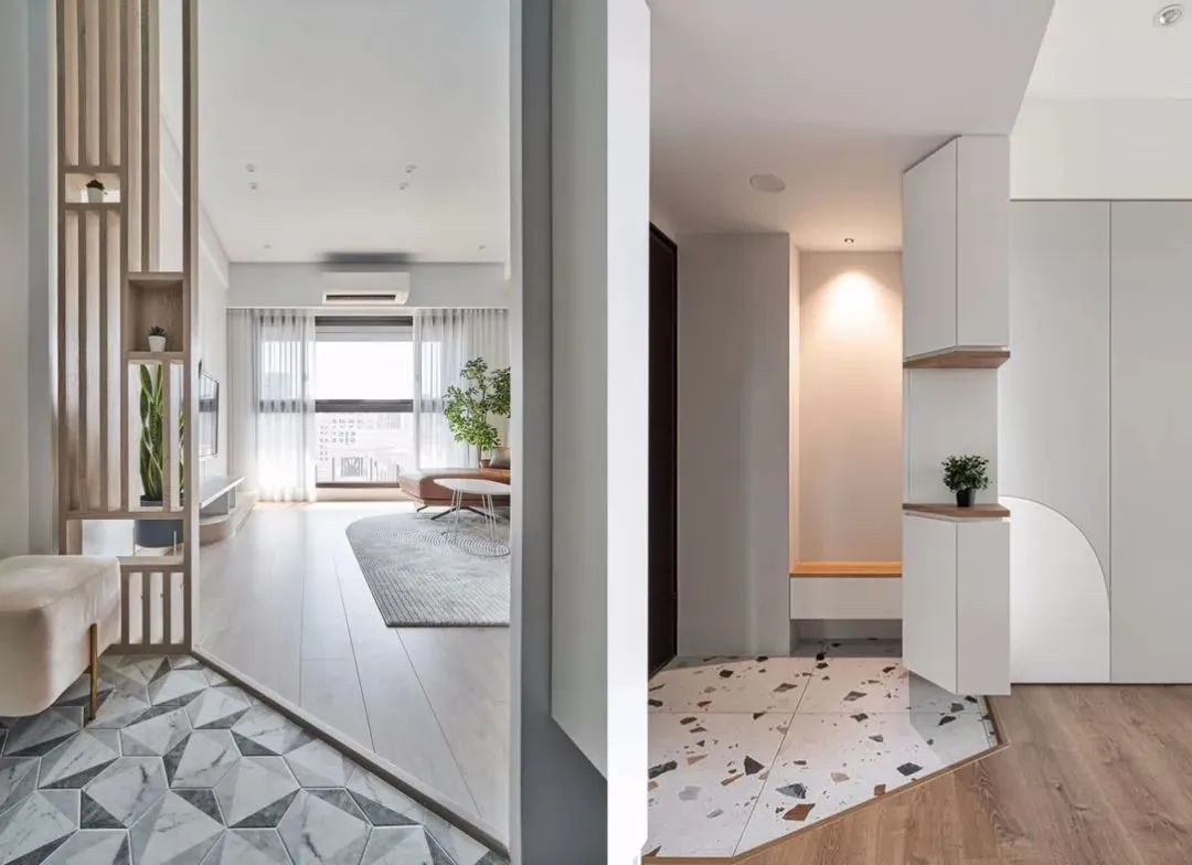 如果玄關客廳通鋪瓷磚那就比較好處理,如果客廳想鋪木地板的話,玄關地面可以選用瓷磚來進行一個空間分隔,這樣不僅有高顏值,還能方便清潔劃分區(qū)域。