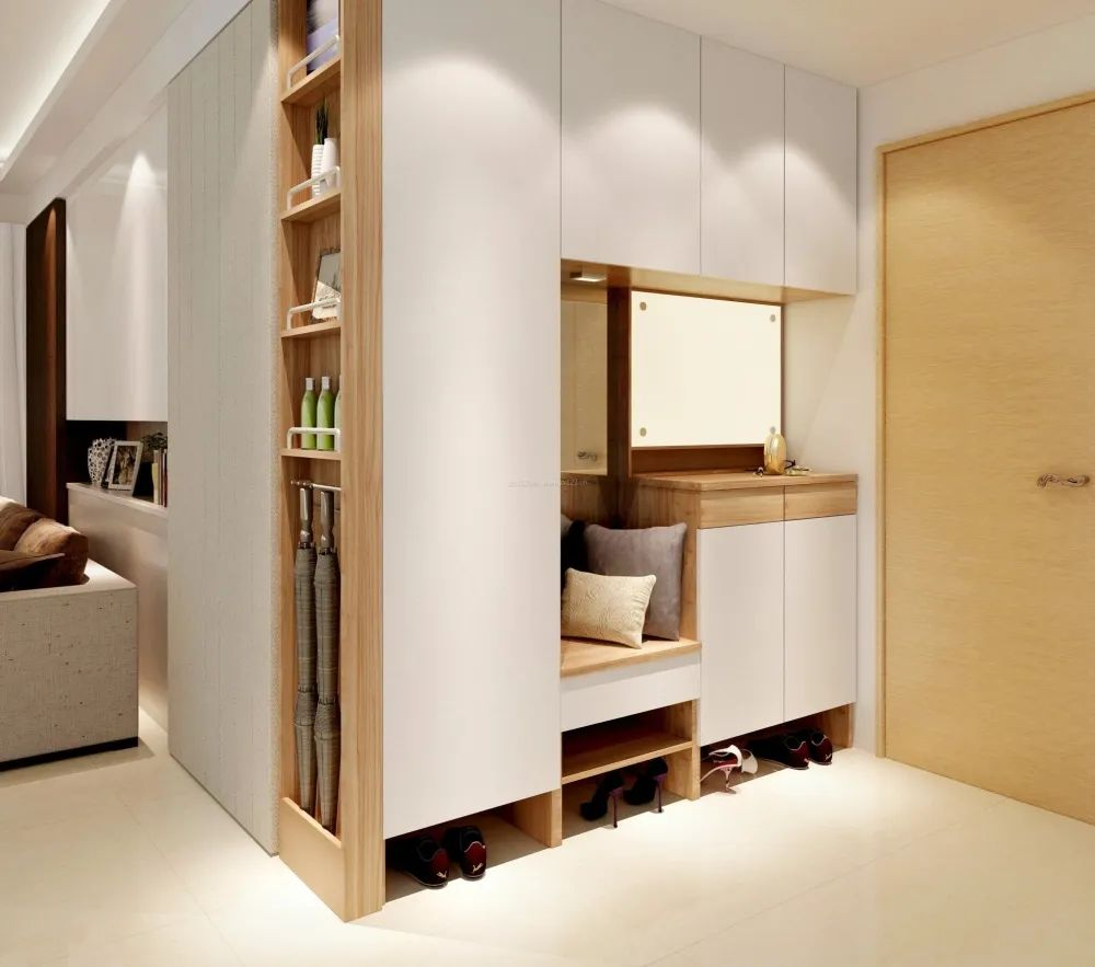 玄關柜要做到頂,否則頂部非常容易積灰難以打掃清理,另一方面,底部抬高懸空,用來滿足“懶人踢”的功能,平時經常會更換的鞋子就可以脫下放在里面,不用再把鞋子放到鞋柜里。
