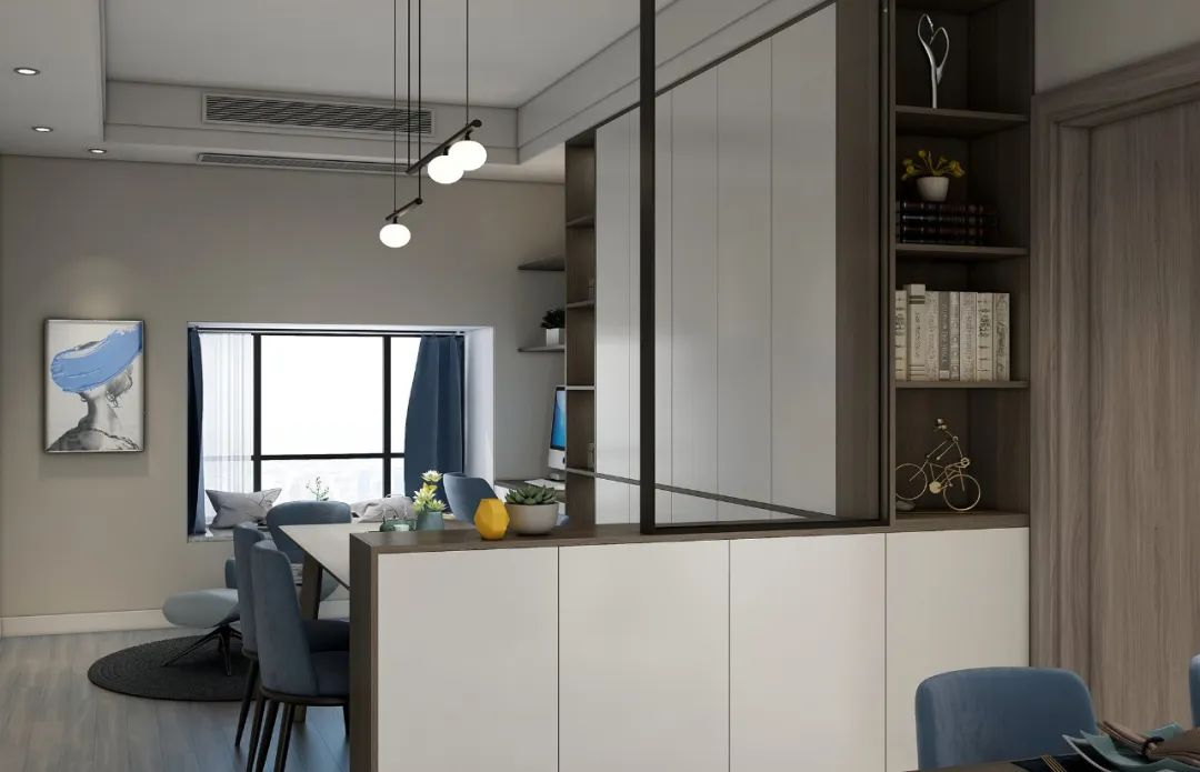 書柜與餐邊柜結合小戶型想要擁有獨立的書房太困難,這種情況下可靈活利用書柜+餐邊柜造出一間多功能"書房"。餐廳的使用率低,日常就餐之外,作為辦公學習之處使用,再合適不過