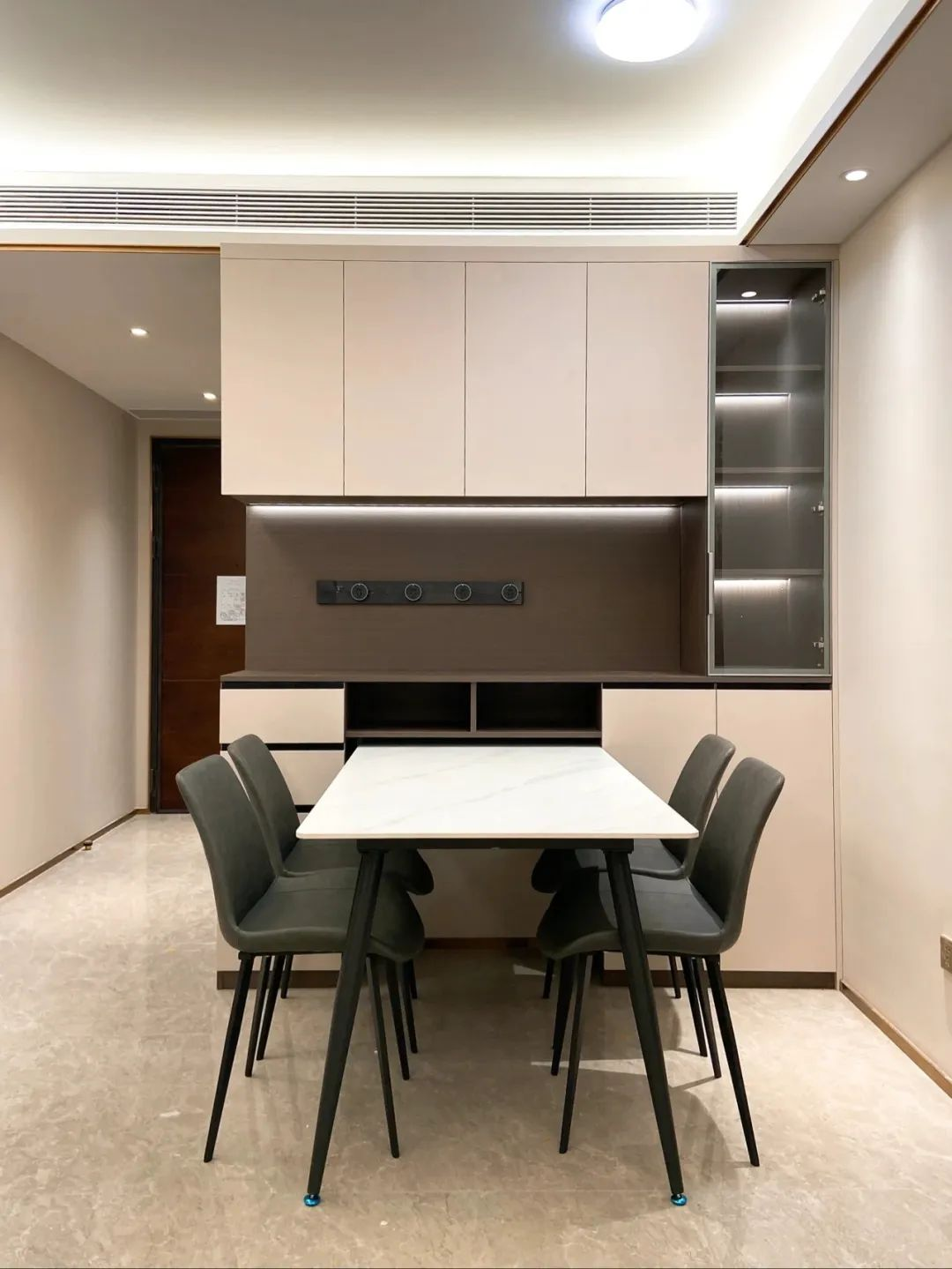 玄關柜與餐邊柜結合入戶和餐廳相連,打造玄關柜時,不妨考慮和餐邊柜一起定制。最常見的是入戶柜和餐邊柜共用同一面墻,視覺流暢,整體設計感更加和諧,有限的空間實現多樣化的功能。
