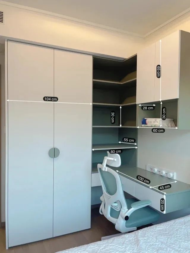 書柜與書桌的功能具有延續性,將兩者結合,設計成轉角式書桌柜,利用兩個墻面做一體化布局,空間利用更充分,十分適合小臥室。