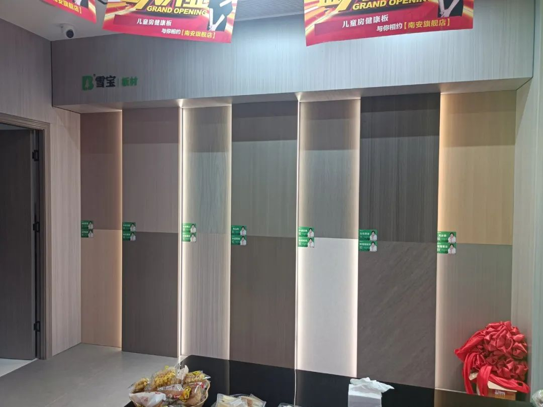 雪寶定位兒童房健康板的獨特差異化優勢,讓品牌理念和高環保高品質產品等標簽深入人心。雪寶泉州南安店在終端形象設計上,緊跟時代潮流,在門店產品陳列、全屋空間展示、門墻柜一體化設計等方面大力迎合消費趨勢,營造居家氛圍體驗感。