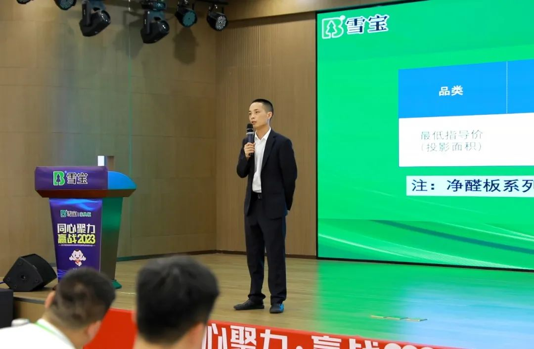 ▲雪寶華南家具板事業部省區經理吳虎講解《雪寶ENF級凈味·純芯板》會上,針對區域市場情況以及客戶培訓訴求,在品牌力、產品力版塊加大力度,詳細講述雪寶品牌實力風采,以及雪寶ENF級實木多層家具板和ENF級凈味·純芯板(OSB)產品介紹,深入淺出概述了品牌的獨特差異化優勢和產品的核心競爭力,讓每一位合作伙伴深度知悉品牌和家具板產品的優勢賣點,相較終端銷售中的競爭品牌和同質化的產品,締造了無懈可擊的雪寶品質,從而贏戰終端。