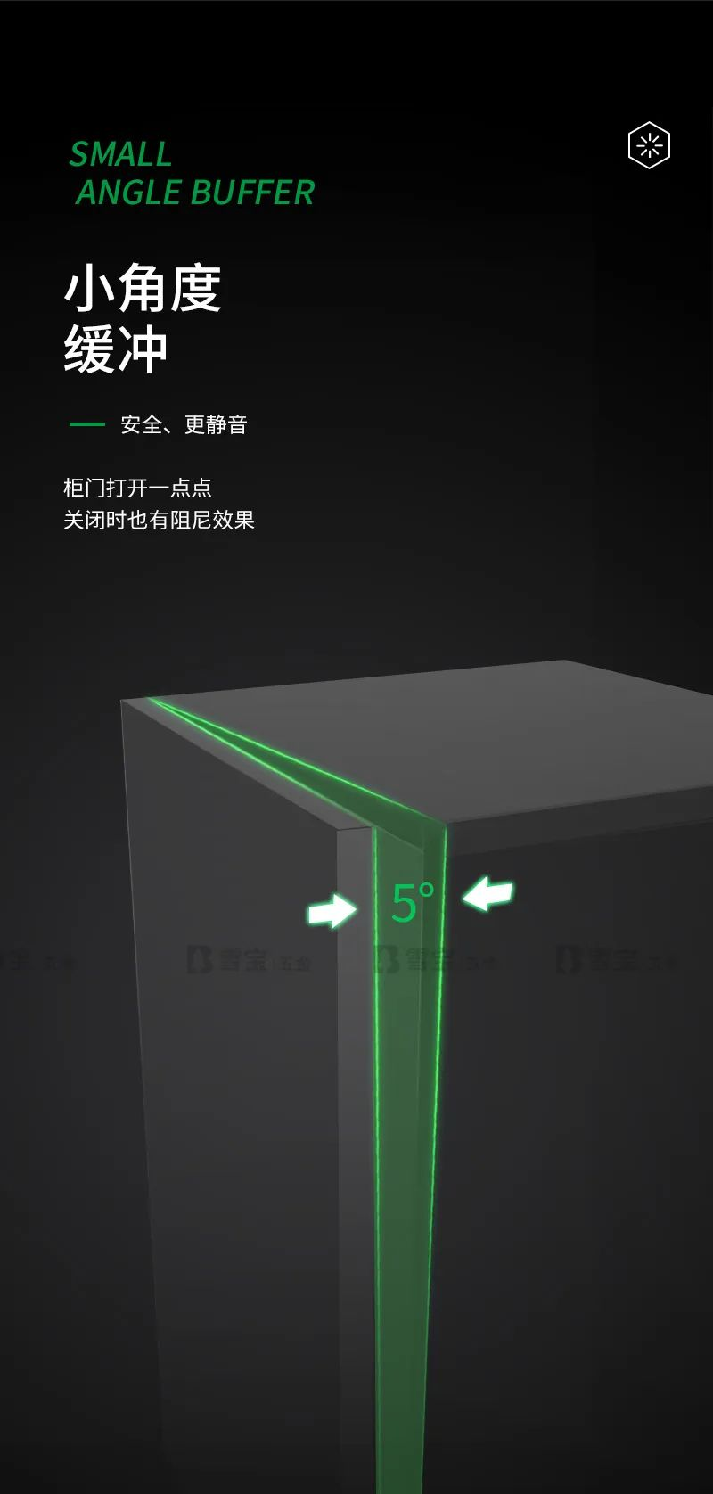1、小角度緩沖,安全更靜音,任意角度開(kāi)啟您的柜門(mén)都有緩沖效果,不會(huì)有撞擊聲音、更不會(huì)夾傷小寶寶的手指;